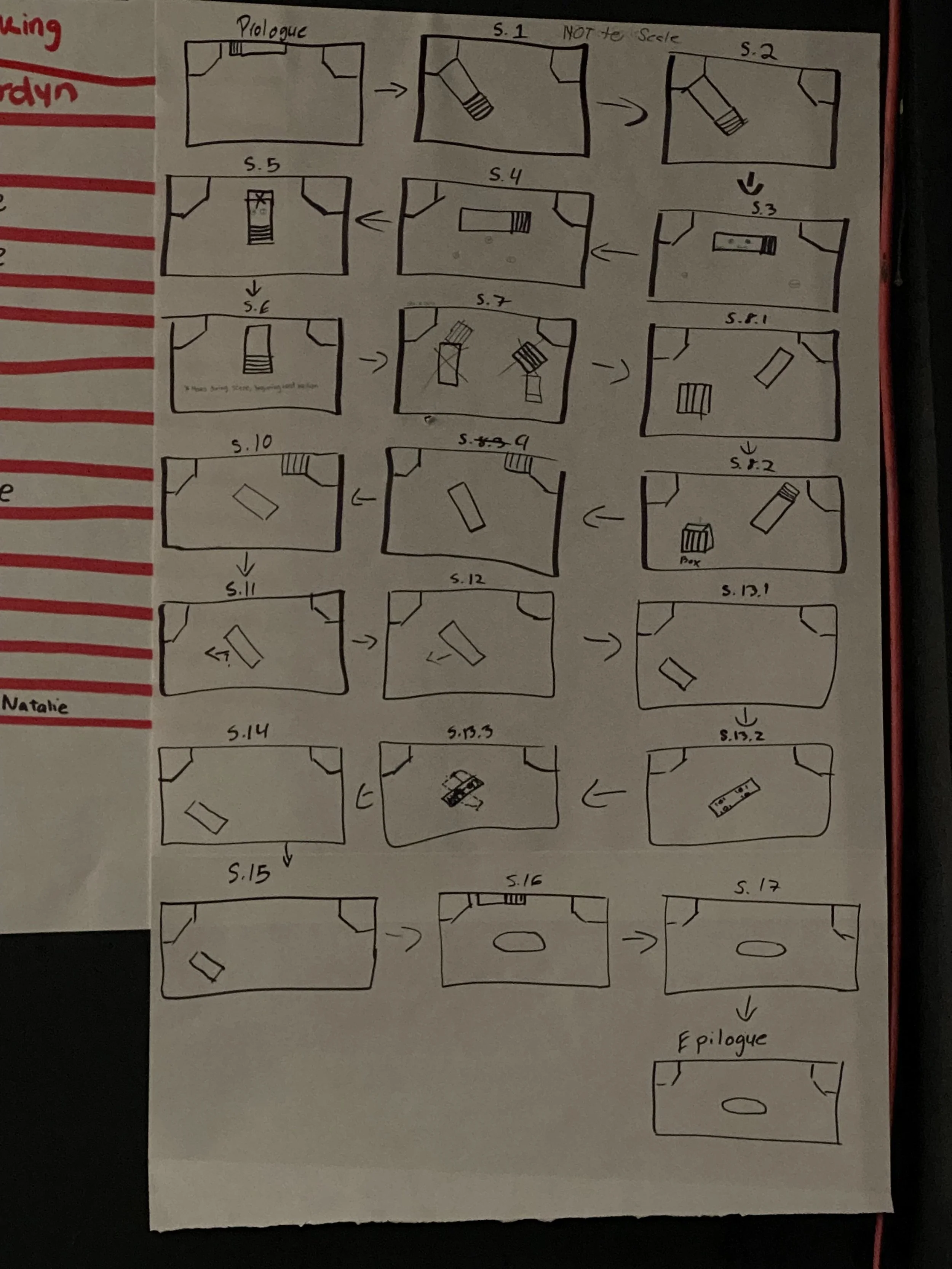 For this show the set was a table, stairs, and some acting boxes. Because of this it was an easier process to make large set movements chart for the actors and management to look at and see if it was correct during rehearsal.